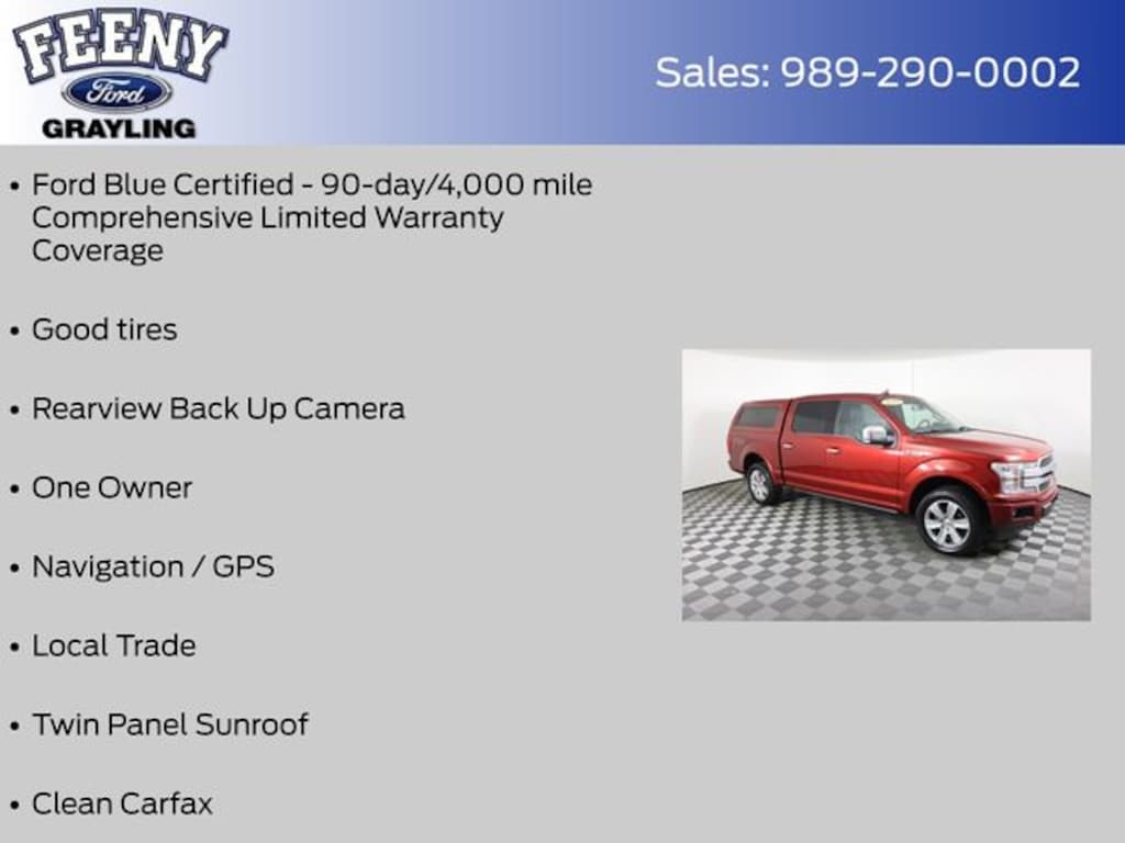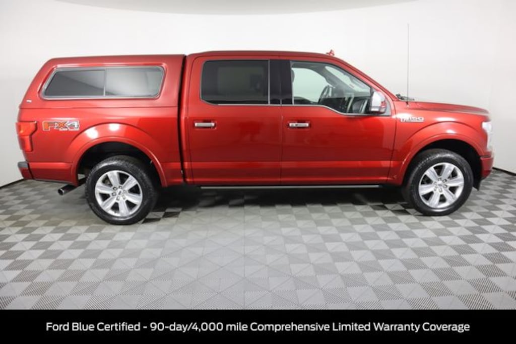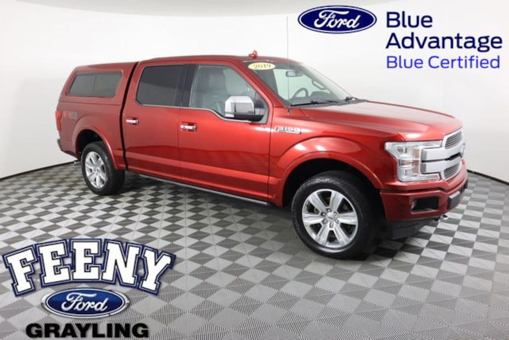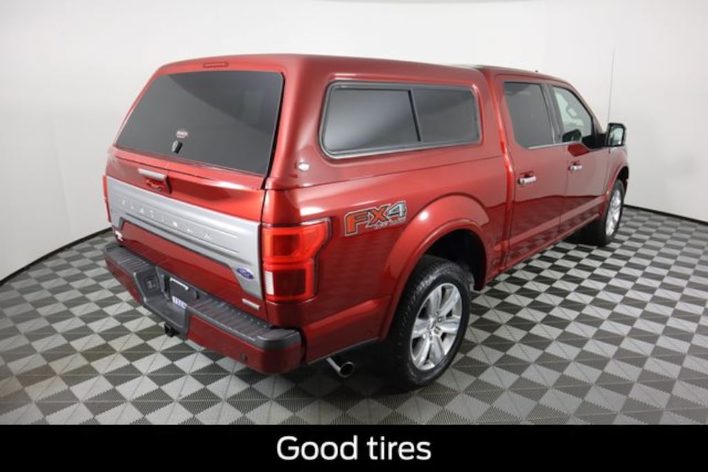 Certified. Ruby Red Metallic Tinted Clearcoat 2019 Ford F-150 Platinum 4WD 10-Speed Automatic 3.5L V6 EcoBoost Ford Blue Certified - 90-day/4,000 mile Comprehensive Limited Warranty Coverage, Good tires, Rearview Back Up Camera, One Owner, Navigation / GPS, Local Trade, Twin Panel Sunroof, Clean Carfax, 4 Wheel Drive / 4WD, Buy with Peace of Mind knowing used vehicle comes with warranty -, Includes Ford Certified Warranty - full tank of gas - two sets of keys - 24 hour roadside assistanc, Bluetooth Connectivity, Ford Pass - Remote Start, Android Auto or Apple Car Play, 4WD, 10 Speakers, 20" Polished Aluminum Wheels, 4-Wheel Disc Brakes, 4x4 FX4 Off-Road Bodyside Decal, ABS brakes, Active Park Assist, Adaptive Cruise Control, Adjustable pedals, Air Conditioning, Alloy wheels, AM/FM radio: SiriusXM, AppLink/Apple CarPlay and Android Auto, Auto High-beam Headlights, Auto tilt-away steering wheel, Auto-dimming door mirrors, Auto-dimming Rear-View mirror, Automatic temperature control, Black Unique Multi-Contour Leather Bucket Seats, Brake assist, Bumpers: body-color, Class IV Trailer Hitch Receiver, Compass, Delay-off headlights, Driver door bin, Driver vanity mirror, Dual front impact airbags, Dual front side impact airbags, Electronic Locking w/3.55 Axle Ratio, Electronic Stability Control, Emergency communication system: SYNC 3 911 Assist, Engine Oil Cooler, Equipment Group 701A Luxury, Extended Range 36 Gallon Fuel Tank, Exterior Parking Camera Rear, Front anti-roll bar, Front Bucket Seats, Front Center Armrest, Front dual zone A/C, Front fog lights, Front reading lights, Front wheel independent suspension, Fully automatic headlights, FX4 Off-Road Package, Garage door transmitter, Genuine wood door panel insert, GVWR: 7,050 lbs Payload Package, Heated door mirrors, Heated front seats, Heated rear seats, Heated steering wheel, Hill Descent Control, Illuminated entry, Integrated Trailer Brake Controller, Lane-Keeping System, Low tire pressure warning, Max Trailer Tow Package, Memory seat, Navigation System, Occupant sensing airbag, Off-Road Tuned Front Shock Absorbers, Outside temperature display, Overhead airbag, Overhead console, Panic alarm, Passenger door bin, Passenger vanity mirror, Pedal memory, Power door mirrors, Power driver seat, Power passenger seat, Power steering, Power windows, Pro Trailer Backup Assist, Radio data system, Radio: B&O Sound System by Bang & Olufsen, Rain sensing wipers, Rear Parking Sensors, Rear reading lights, Rear seat center armrest, Rear step bumper, Rear window defroster, Remote keyless entry, Security system, Speed control, Speed-sensing steering, Split folding rear seat, Steering wheel memory, Steering wheel mounted audio controls, SYNC 3, Tachometer, Tailgate Step w/Tailgate Lift Assist, Technology Package, Telescoping steering wheel, Tilt steering wheel, Tough Bed Spray-In Bedliner, Traction control, Tray Style Floor Liner, Turn signal indicator mirrors, Twin Panel Moonroof, Upgraded Front Stabilizer Bar, Variably intermittent wipers, Ventilated front seats, Voice-Activated Touchscreen Navigation, Voltmeter.
