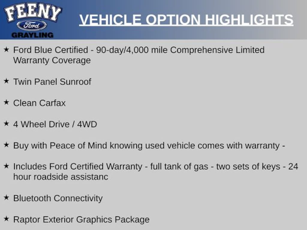 Certified. Ingot Silver Metallic 2019 Ford F-150 Raptor 4WD 10-Speed Automatic 3.5L V6 EcoBoost Ford Blue Certified - 90-day/4,000 mile Comprehensive Limited Warranty Coverage, Twin Panel Sunroof, Clean Carfax, 4 Wheel Drive / 4WD, Buy with Peace of Mind knowing used vehicle comes with warranty -, Includes Ford Certified Warranty - full tank of gas - two sets of keys - 24 hour roadside assistanc, Bluetooth Connectivity, F-150 Raptor, 4D SuperCrew, 3.5L V6 EcoBoost, 10-Speed Automatic, 4WD, Ingot Silver Metallic, Black w/Leather-Trimmed Bucket Seats, 17" Forged Aluminum Bead-Lock Capable Wheels, 360 Degree Camera, 4.10 Front Axle w/Torsen Differential, 8" Productivity Screen, Adaptive Cruise Control w/Stop-and-Go, Advanced Security Pack, Ambient Lighting - Ice Blue Color Only, BLIS Blind Spot Information System, Dual-Zone Electronic Automatic Temperature Control, Equipment Group 802A Luxury, GVWR: 7,050 lbs Payload Package, Heated & Ventilated Leather 40/Console/40 Front Seats, Heated Steering Wheel, Inflatable Rear Safety Belts, Integrated Trailer Brake Controller, Intelligent Access w/Push-Button Start, Lane Keeping System w/Alert & Assist, LED Box Lighting, LED Sideview Mirror Spotlights, Memory System (Seat, Pedal, Exterior Mirror), Power Glass Heated Sideview Mirrors, Power Tilt/Telescoping Steering Column w/Memory, Power-Adjustable Pedals, Power-Sliding Rear Window, Pro Trailer Backup Assist, Radio: B&O Sound System by Bang & Olufsen, Rain-Sensing Windshield Wipers, Raptor Exterior Graphics Package, Raptor Hood Graphics Package, Raptor Technology Package, Remote Start System w/Remote Tailgate Release, Tailgate Applique FORD, Tough Bed Spray-In Bedliner, Twin Panel Moonroof, Universal Garage Door Opener, Voice-Activated Touchscreen Navigation.