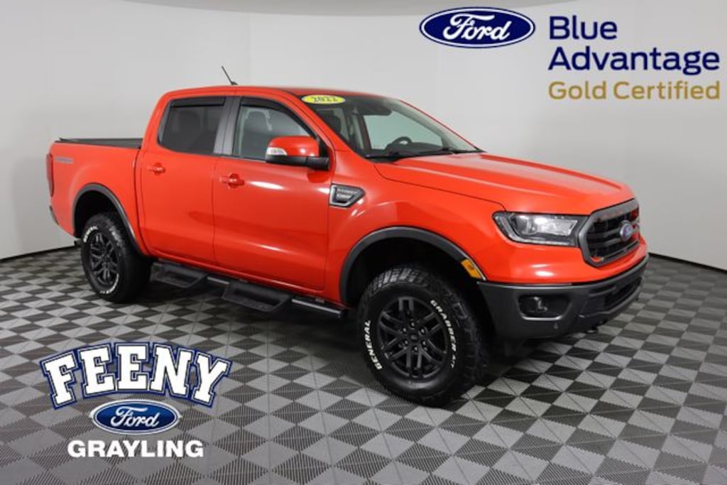 Certified. Race Red 2022 Ford Ranger Lariat 4WD 10-Speed Automatic EcoBoost 2.3L I4 GTDi DOHC Turbocharged VCT Ford Certified - Includes 12-month/12,000 mile Comprehensive Limited Warranty Coverage - 7-year/100, One Owner, Clean Carfax, 4 Wheel Drive / 4WD, Buy with Peace of Mind knowing used vehicle comes with warranty -, Includes Ford Certified Warranty - full tank of gas - two sets of keys - 24 hour roadside assistanc, Bluetooth Connectivity, Ford Pass - Remote Start, Android Auto or Apple Car Play, Ranger Lariat, 4D Crew Cab, EcoBoost 2.3L I4 GTDi DOHC Turbocharged VCT, 10-Speed Automatic, 4WD, Race Red, Ebony Leather, 2 4.2 Colored Productivity Screens, Black Interior Accents, Black Off-Road Hoop Steps, Blk Mesh Grille w/Magnetic Pntd Surround/Blk Bars, Class IV Trailer Hitch Receiver, Electronic-Locking Rear Differential, Equipment Group 501A High, Fr Lthr-Trimmed Bucket Seats w/Miko Suede Inserts, Heated front seats, Magnetic Painted Fender Vent Surround, Magnetic Painted Front & Rear Bumper, Magnetic Painted Wheel Arch Flare, Off-Road Screen in Cluster, Off-Road Tuned Suspension w/FOX Dampers, Power passenger seat, Radio: B&O Sound System by Bang & Olufsen, Rain-Sensing Wipers, Rear Tow Hooks, Remote Start, Technology Package, Terrain Management System, Trail Control, Trailer Tow Package, Tray Style Floor Liner w/Carpet Floor Mats, Tremor Box Decal, Tremor Off-Road Package, Universal Garage Door Opener (UGDO), Upfitter Switches (6), Wheels: 18" Machined Alum w/Stealth Gray Pockets.
