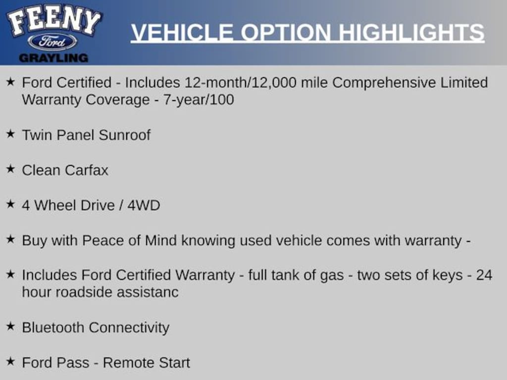 Certified. Oxford White 2023 Ford F-150 Tremor 4WD 10-Speed Automatic 3.5L V6 EcoBoost Ford Certified - Includes 12-month/12,000 mile Comprehensive Limited Warranty Coverage - 7-year/100, Twin Panel Sunroof, Clean Carfax, 4 Wheel Drive / 4WD, Buy with Peace of Mind knowing used vehicle comes with warranty -, Includes Ford Certified Warranty - full tank of gas - two sets of keys - 24 hour roadside assistanc, Bluetooth Connectivity, Ford Pass - Remote Start, Android Auto or Apple Car Play, F-150 Tremor, 4D SuperCrew, 3.5L V6 EcoBoost, 10-Speed Automatic, 4WD, Oxford White, Black w/Unique Sport Cloth 40/Console/40 Front-Seats, Class IV Trailer Hitch Receiver, Electronic Locking w/3.73 Axle Ratio, Equipment Group 401A Standard, Front Bucket Seats, GVWR: 7,000 lbs Payload Package, Heated front seats, Integrated Trailer Brake Controller, Power passenger seat, Twin Panel Moonroof, Wheels: 18" Alloy w/Dark Matte Finish.