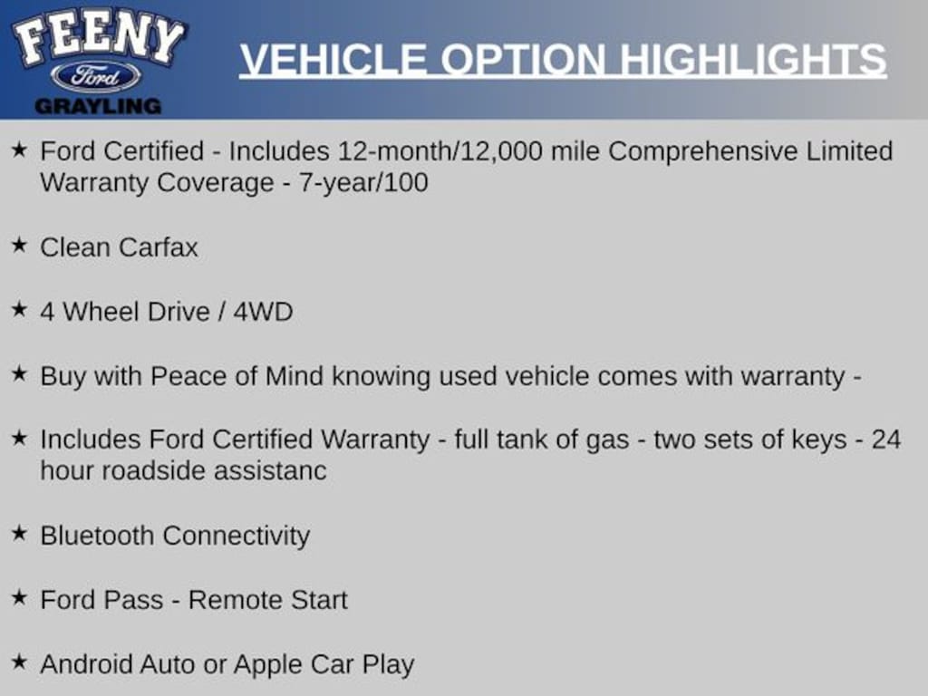 - Includes Ford Certified Warranty - full tank of gas - two sets of keys - 24 hour roadside assistance