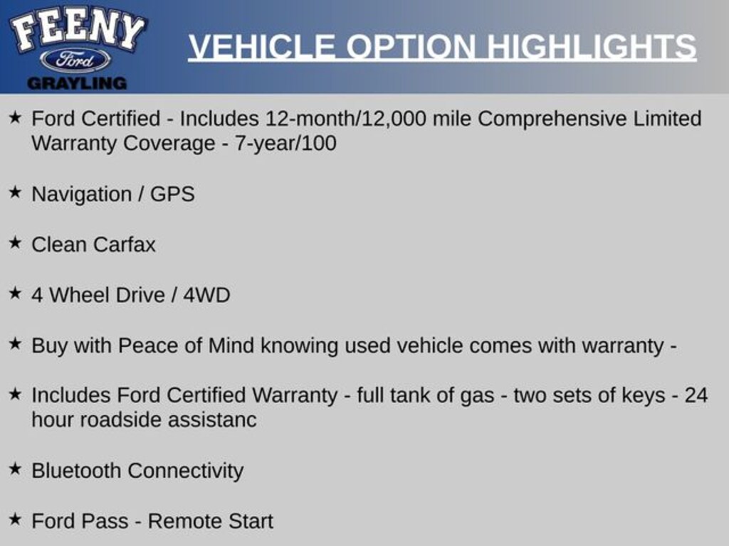 - Ford Certified - Includes 12-month/12,000 mile Comprehensive Limited Warranty Coverage