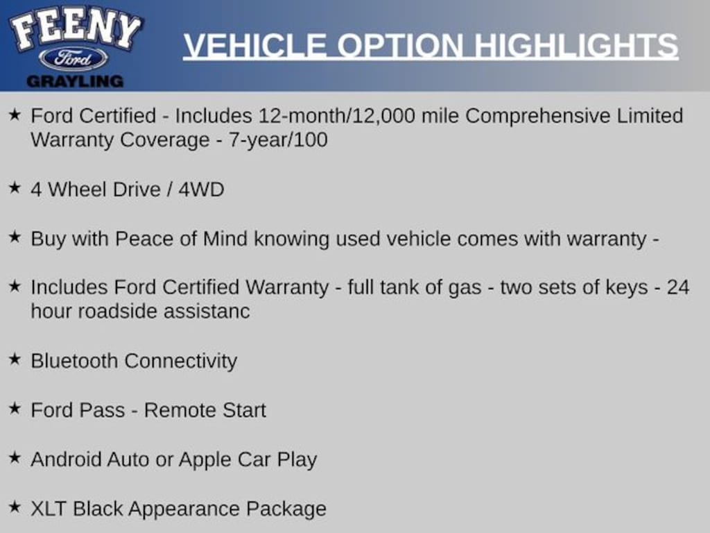 - Ford Certified - Includes 12-month/12,000 mile Comprehensive Limited Warranty Coverage - 7-year/100
