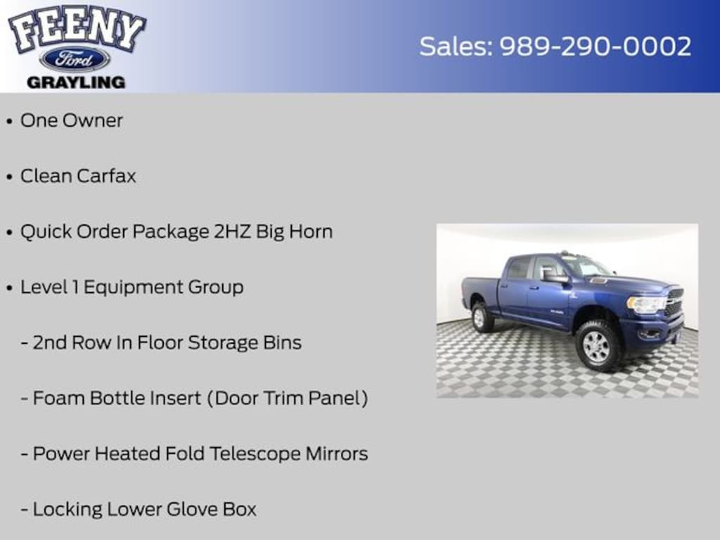 Certified. Patriot Blue Pearlcoat 2024 Ram 2500 Big Horn 4WD 6-Speed Automatic Cummins 6.7L I6 Turbodiesel One Owner, Clean Carfax, 2500 Big Horn, 4D Crew Cab, Cummins 6.7L I6 Turbodiesel, 6-Speed Automatic, 4WD, Patriot Blue Pearlcoat, Black Cloth, 2nd Row In Floor Storage Bins, 4G LTE Wi-Fi Hot Spot, 5th Wheel/Gooseneck Towing Prep Group, 8.4" Touchscreen Display, Anti-Spin Differential Rear Axle, Apple CarPlay, Auto Power-Folding Mirrors, Auxiliary Switches Prep, Bed Utility Group, Big Horn IP Badge, Black Exterior Mirrors, Black Interior Accents, Bluetooth Handsfree Phone & Audio, Body Color Door Handles, Body Color Grille Surround, Center Hub, Clearance Lamps, Connectivity - US/Canada, Dual Glove Boxes, Exterior Mirrors Courtesy Lamps, Exterior Mirrors w/Heating Element, Exterior Mirrors w/Supplemental Signals, Foam Bottle Insert (Door Trim Panel), Footwell Courtesy Lamp, For Details, Visit DriveUconnect.com, For More Info, Call 800-643-2112, Forward & Reverse Utility Lights, Front Fog Lamps, Global Telematics Box Module (TBM), Glove Box Lamp, Google Android Auto, GPS Antenna Input, Heated Front Seats, Heated Seats & Wheel Group, Heated Steering Wheel, I/P Mounted Auxiliary Switches, Integrated Center Stack Radio, Integrated Voice Command w/Bluetooth, Leather Wrapped Steering Wheel, LED Bed Lighting, Level 1 Equipment Group, Locking Lower Glove Box, Mirror Running Lights, MOPAR Deployable Bed Step, MOPAR Spray In Bedliner, Painted Front Bumper, Painted Rear Bumper, ParkSense Front/Rear Park Assist System, Power Adjust Mirrors, Power Adjustable Convex Aux Mirrors, Power Heated Fold Telescope Mirrors, Power Telescoping Mirrors, Premium Cloth 40/20/40 Bench Seat, Quick Order Package 2HZ Big Horn, Radio: Uconnect 5 W w/8.4" Display (A62), Rear Dome w/On/Off Switch Lamp, Selectable Tire Fill Alert, SiriusXM Radio Service, SiriusXM Satellite Radio, Snow Chief Group, Sport Appearance Package, Sport Decal, Steering Wheel Mounted Audio Controls, Wheels: 18" x 8.0" Polished Aluminum.