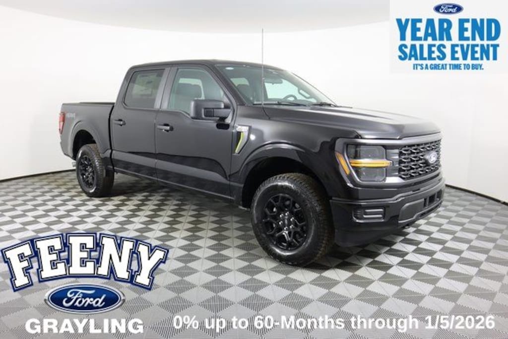 Agate Black Metallic 2025 Ford F-150 STX 4WD 10-Speed Automatic 2.7L V6 EcoBoost Bluetooth Connectivity, Ford Pass - Remote Start, Android Auto or Apple Car Play, Ford Bed Liner, Tailgate Decal, Weather Tech Floor Mats, F-150 STX, 4D SuperCrew, 2.7L V6 EcoBoost, 10-Speed Automatic, 4WD, Agate Black Metallic, Black w/Unique Sport Cloth 40/Console/40 Front-Seats, 3.55 Axle Ratio, 4-Wheel Disc Brakes, 6 Speakers, ABS brakes, Air Conditioning, Alloy wheels, Auto High-beam Headlights, Brake assist, Bumpers: body-color, Compass, Delay-off headlights, Driver door bin, Dual front impact airbags, Dual front side impact airbags, Electronic Stability Control, Emergency communication system: SYNC 4 911 Assist, Equipment Group 200B Standard, Front anti-roll bar, Front Bucket Seats, Front Center Armrest, Front reading lights, Front wheel independent suspension, Fully automatic headlights, GVWR: 6,650 lbs Payload Package, Heated door mirrors, Illuminated entry, Low tire pressure warning, Occupant sensing airbag, Outside temperature display, Overhead airbag, Overhead console, Panic alarm, Passenger door bin, Passenger vanity mirror, Power door mirrors, Power steering, Power windows, Radio data system, Rear Parking Sensors, Rear step bumper, Rear window defroster, Remote keyless entry, Security system, Speed control, Split folding rear seat, Steering wheel mounted audio controls, SYNC 4 w/Enhanced Voice Recognition, Tachometer, Telescoping steering wheel, Tilt steering wheel, Traction control, Trip computer, Unique Sport Cloth 40/Console/40 Front-Seats, Variably intermittent wipers, Voltmeter, Wheels: 18" Gloss Black.
