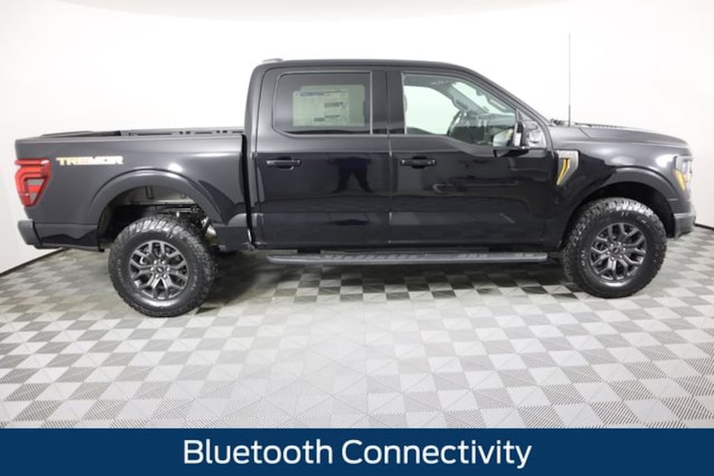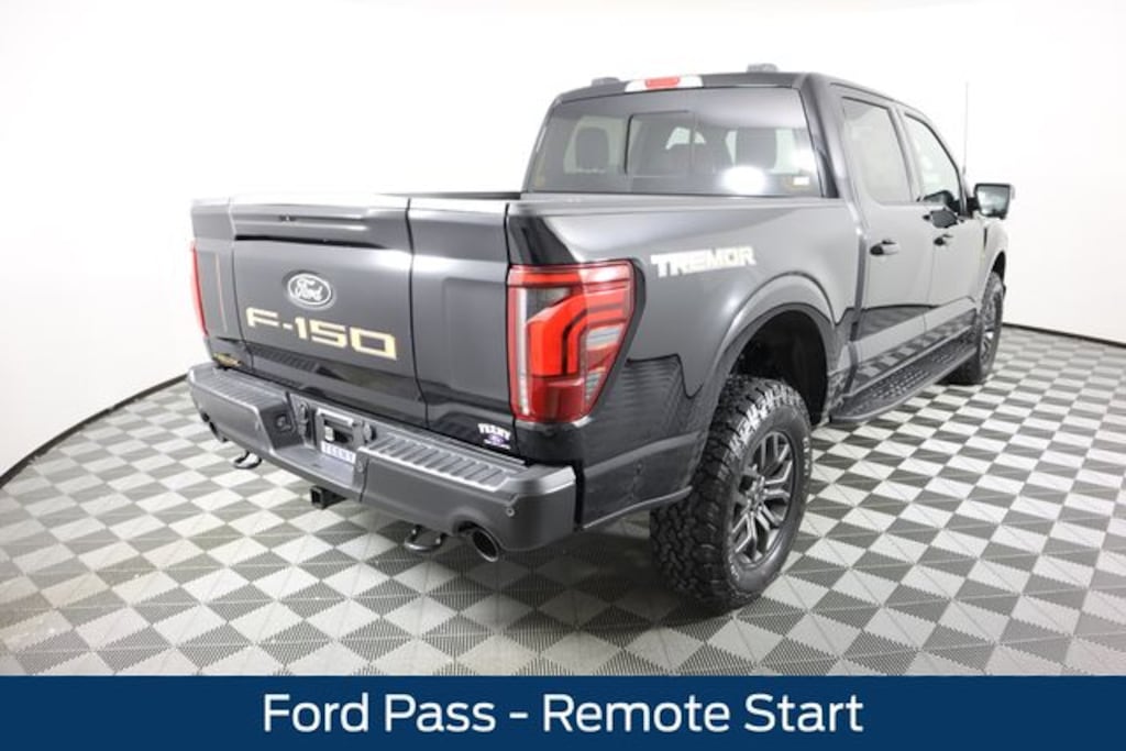Agate Black Metallic 2025 Ford F-150 Tremor 4WD 10-Speed Automatic 3.5L V6 EcoBoost Bluetooth Connectivity, Ford Pass - Remote Start, Android Auto or Apple Car Play, FRONT AND REAR WEATHER TECH MATS, SECURICODE WIRELESS KEYLESS ENTRY, 4WD, 2nd Row Heated Seats, 4 Pickup Box Tie-Down Plates, 4-Wheel Disc Brakes, 8 Speakers, ABS brakes, Adjustable pedals, Air Conditioning, Alloy wheels, AM/FM radio: SiriusXM with 360L, Ambient Lighting, Auto High-beam Headlights, Auto-dimming door mirrors, Auto-Dimming Rear-View Mirror, Auto-dimming Rear-View mirror, Automatic temperature control, Bed Utility Package, Brake assist, Bumpers: body-color, Compass, Console Worksurface, Delay-off headlights, Driver door bin, Driver vanity mirror, Dual front impact airbags, Dual front side impact airbags, Electronic Locking w/3.73 Axle Ratio, Electronic Stability Control, Emergency communication system: SYNC 4 911 Assist, Equipment Group 402A High, Front anti-roll bar, Front Axle w/Torsen Differential, Front Bucket Seats, Front Center Armrest, Front dual zone A/C, Front fog lights, Front reading lights, Front wheel independent suspension, Fully automatic headlights, GVWR: 7,050 lbs Payload Package, Heads-Up Display, Heated door mirrors, Heated front seats, Heated Steering Wheel, Illuminated entry, Illuminated Ford Logo Badge DIO, Integrated Trailer Brake Controller, LED Box Lighting, LED Taillamps, Low tire pressure warning, Media Bin Door, Mobile Office Package, Modular Front Bumper & Carbon Black Rear Bumper, Navigation system: Connected Navigation 1yr included, Occupant sensing airbag, Outside temperature display, Overhead airbag, Overhead console, Panic alarm, Partitioned Lockable Rear Storage, Passenger door bin, Passenger vanity mirror, Power door mirrors, Power driver seat, Power Glass Heated Sideview Mirrors, Power passenger seat, Power steering, Power Tailgate, Power windows, Power-Adjustable Pedals w/Memory, Premium Wrapped Steering Wheel, Radio data system, Radio: B&O Sound System by Bang & Olufsen, Radio: B&O Unleashed Sound System by Bang & Olufsen, Rain-Sensing Wipers, Rear reading lights, Rear step bumper, Rear window defroster, Remote keyless entry, SecuriCode Keyless-Entry Keypad (DIO), Security system, Split folding rear seat, Steering wheel mounted audio controls, SYNC 4 w/Enhanced Voice Recognition, Tachometer, Telescoping steering wheel, Tilt steering wheel, Tough Bed Spray-In Bedliner, Tow/Haul Package, Traction control, Trip computer, Turn signal indicator mirrors, Twin Panel Moonroof, Two-Speed Automatic AWD w/Mechanical Locking 4WD, Unique Sport Cloth 40/Console/40 Power Front Seat, Unique Tremor Leather-Trimmed Bucket Seats, Universal Garage Door Opener, Variably intermittent wipers, Voltmeter, Wheels: 18" Alloy w/Dark Matte Finish, Wireless Charging.