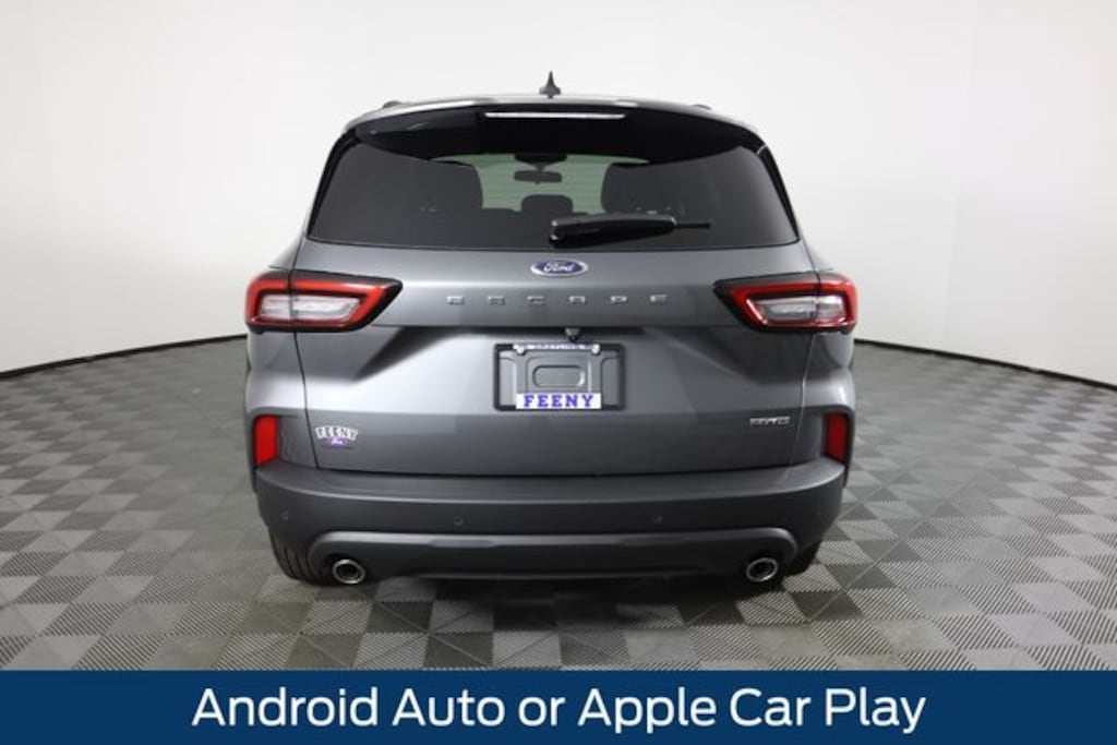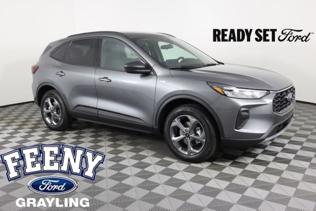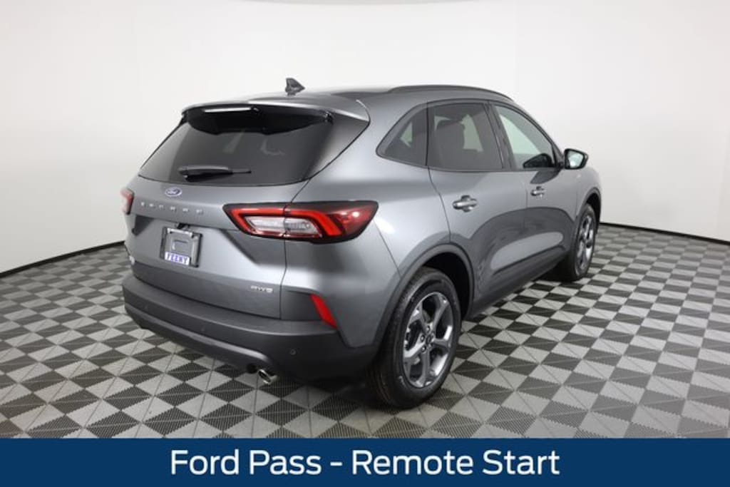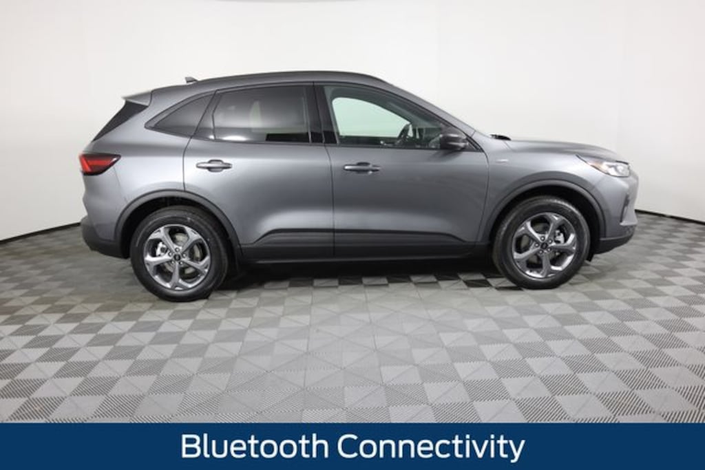 carbonized gray metallic 2026 Ford Escape ST-Line AWD 8-Speed Automatic 1.5L EcoBoost Bluetooth Connectivity, Ford Pass - Remote Start, Android Auto or Apple Car Play, FRONT AND REAR WEATHER TECHMATS, Escape ST-Line, 4D Sport Utility, 1.5L EcoBoost, 8-Speed Automatic, AWD, carbonized gray metallic, Ebony w/Heated Vinyl/Cloth Front Sport Contour Bucket Seats, 3.81 Axle Ratio, 4-Wheel Disc Brakes, 6 Speakers, ABS brakes, Air Conditioning, Alloy wheels, Auto High-beam Headlights, Automatic temperature control, Brake assist, Bumpers: body-color, Cold Weather Package, Compass, Delay-off headlights, Driver door bin, Driver vanity mirror, Dual front impact airbags, Dual front side impact airbags, Electronic Stability Control, Emergency communication system: SYNC 4 911 Assist, Equipment Group 300A, Ford App, Ford Co-Pilot360 Assist+, Four wheel independent suspension, Front anti-roll bar, Front Bucket Seats, Front Center Armrest, Front dual zone A/C, Front reading lights, Fully automatic headlights, Heated Front Row Seats, Heated Sideview Mirrors, Heated Steering Wheel, Illuminated entry, Intersection Assist, Knee airbag, Low tire pressure warning, Occupant sensing airbag, Outside temperature display, Overhead airbag, Overhead console, Panic alarm, Passenger door bin, Passenger vanity mirror, Power door mirrors, Power driver seat, Power Liftgate, Power steering, Power windows, Predictive Speed Assist, Radio data system, Rear anti-roll bar, Rear Parking Sensor, Rear reading lights, Rear seat center armrest, Rear window defroster, Rear window wiper, Remote keyless entry, Remote Starter System, Speed control, Speed-sensing steering, Speed-Sensitive Wipers, Split folding rear seat, Spoiler, Sport steering wheel, Steering wheel mounted audio controls, SYNC 4, Tachometer, Tech Pack #1, Telescoping steering wheel, Tilt steering wheel, Traction control, Trip computer, Variably intermittent wipers, Wheels: 18" Rock Metallic Painted Aluminum.