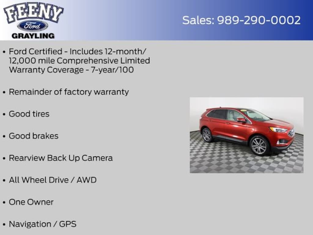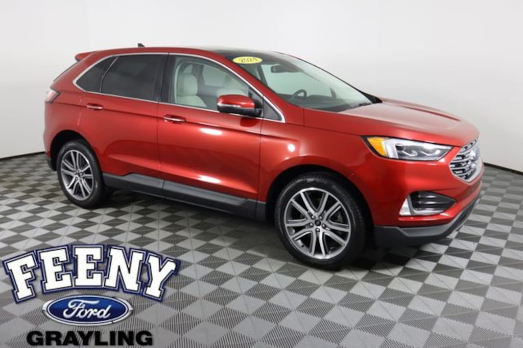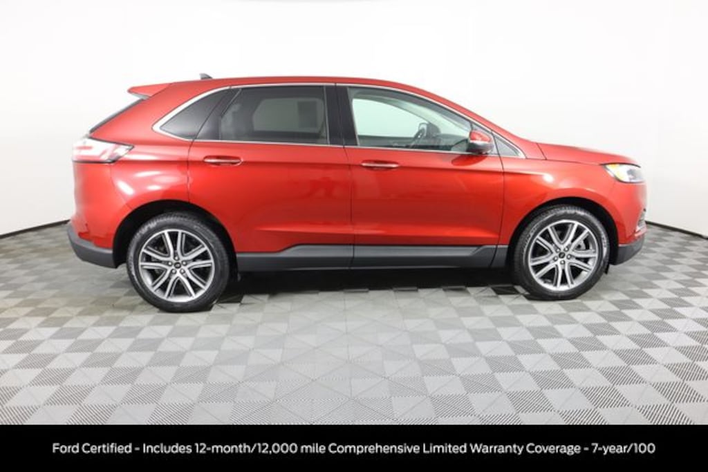 Rapid Red Metallic Tinted Clearcoat 2024 Ford Edge Titanium AWD 8-Speed Automatic EcoBoost 2.0L I4 GTDi DOHC Turbocharged VCT Ford Certified - Includes 12-month/12,000 mile Comprehensive Limited Warranty Coverage - 7-year/100, Remainder of factory warranty, Good tires, Good brakes, Rearview Back Up Camera, All Wheel Drive / AWD, One Owner, Navigation / GPS, Local Trade, Twin Panel Sunroof, Clean Carfax, Buy with Peace of Mind knowing used vehicle comes with warranty -, Includes Ford Certified Warranty - full tank of gas - two sets of keys - 24 hour roadside assistanc, Bluetooth Connectivity, Ford Pass - Remote Start, Android Auto or Apple Car Play, AWD, 12 Speakers, 3.80 Axle Ratio, 4-Wheel Disc Brakes, ABS brakes, ActiveX-Trimmed Heated Sport Bucket Seats, Adaptive Cruise Control w/Stop & Go, Adaptive LED Headlamps, Air Conditioning, Alloy wheels, AM/FM radio: SiriusXM with 360L, Auto High-beam Headlights, Auto-Dimming Driver's Sideview Mirror, Auto-dimming Rear-View mirror, Automatic temperature control, Brake assist, Bumpers: body-color, Compass, Connected Navigation, Cooled Front Seats, Delay-off headlights, Driver door bin, Driver vanity mirror, Dual front impact airbags, Dual front side impact airbags, Electronic Stability Control, Emergency communication system: SYNC 4 911 Assist, Equipment Group 301A, Evasive Steering Assist, FordPass Connect, Four wheel independent suspension, Front 180-Degree Camera w/Split View, Front anti-roll bar, Front Bucket Seats, Front Center Armrest w/Storage, Front dual zone A/C, Front fog lights, Front reading lights, Fully automatic headlights, Garage door transmitter, Heated door mirrors, Heated front seats, Heated Rear Seats, Heated steering wheel, Illuminated entry, Knee airbag, Lane Centering, Leather steering wheel, Low tire pressure warning, Memory seat, Occupant sensing airbag, Outside temperature display, Overhead airbag, Overhead console, Panic alarm, Panoramic Vista Roof, Passenger door bin, Passenger vanity mirror, Power door mirrors, Power driver seat, Power Liftgate, Power passenger seat, Power steering, Power Tilt/Telescoping Steering Column w/Memory, Power windows, Radio: B&O Sound System by Bang & Olufsen, Rain sensing wipers, Rear anti-roll bar, Rear reading lights, Rear seat center armrest, Rear window defroster, Rear window wiper, Remote keyless entry, Security system, SiriusXM w/360L, Speed-Sensitive Wipers, Split folding rear seat, Spoiler, Steering wheel mounted audio controls, SYNC 4A w/Enhanced Voice Recognition, Tachometer, Telescoping steering wheel, Tilt steering wheel, Traction control, Trip computer, Turn signal indicator mirrors, Variably intermittent wipers, Wheels: 20" Bright-Machined Aluminum.