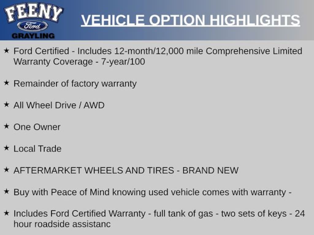 - Ford Certified - includes 12-month/12,000-mile comprehensive limited warranty coverage